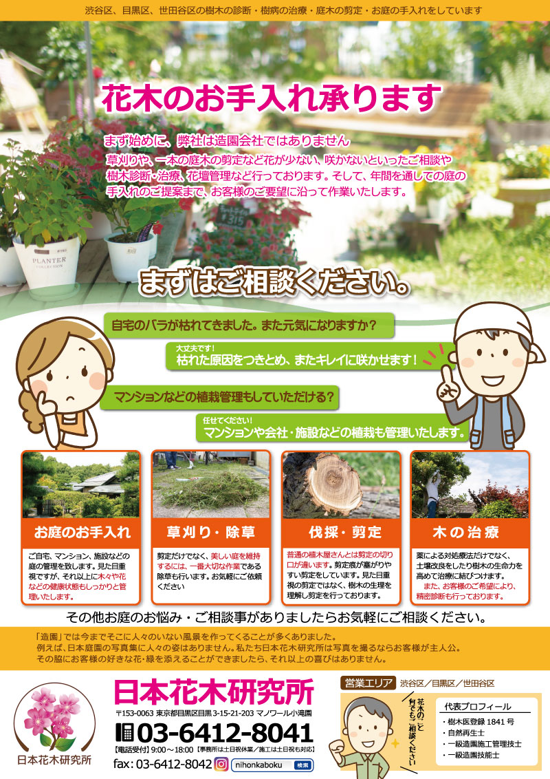 2016年10月21日 / 最終更新日時 : 2016年10月21日 raffi 未分類 日本花木研究所のチラシリニューアルしました。2016年11月版 チラシリニューアルしました。少しは親しみやすい感じになったでしょうか(笑) 自分で作ると思い入れが強く固くなりますので、私の好きなデザイナーさんにお願いしました。 Follow me! @nihonkaboku More from my site嘘のない仕事のつくり方予約や、見積もりのご依頼はお早めにお願いいたします。7月、9月はもうすぐいっぱいです。お客様とのやり取りは「リモートワーク」にて。未来の緑の守護者たち: 30年後の樹木医の進化新しい音楽を。2月はバラの冬季剪定の適期です。 コメントを残す コメントをキャンセルメールアドレスが公開されることはありません。 * が付いている欄は必須項目ですコメント 名前 * メール * サイト 次回のコメントで使用するためブラウザーに自分の名前、メールアドレス、サイトを保存する。 Δ